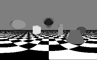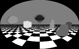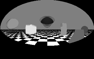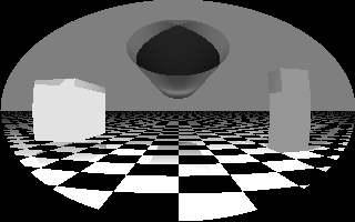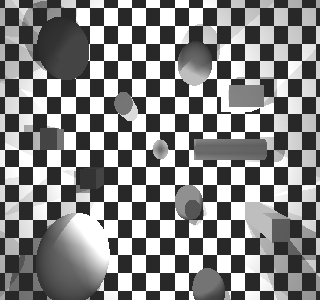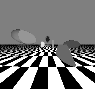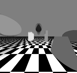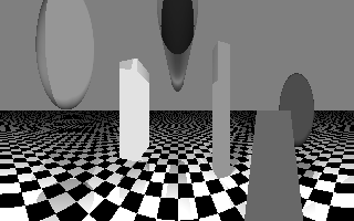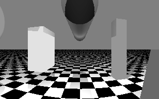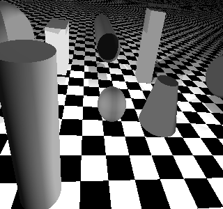 Hier wird die Standardcamera verwendet, die "perspectivische" (perspective) Kamera, welche Zentralprojektion verwendet. Die Zentralprojektion ist auch in diesem Bild zu erkennen, zum Beispiel an dem hohen Quader rechts unten, bei dem man bereits zwei Seiten sieht, obwohl er parallel zur Kamera-Ursprungs-Achse steht.