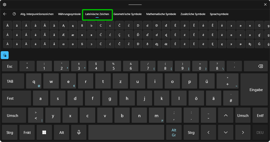 Wenn Sie nur nach einer schnellen Eingabemöglichkeit für solche Zeichen suchen und auf die Hintergrundinformationen verzichten können, sollten Sie die zusätzliche Bildschirmtastatur aktivieren oder die MS-PowerToys installieren, wie in Wenn Sie auf der Tastatur eine Zeichenkette ("Text") eintippen, dann sendet die Tastatur eine entsprechende Scancode-Kette an den Tastaturtreiber im PC und der reicht die zugehörigen Zeichencodes weiter an die Anwendung. Dabei kommt es darauf an, welche Codepage in Windows aktiv ist, denn dort steht, welche Buchstaben oder welche Sonderzeichen aufgrund der übermittelten Zeichencodes gemeint sein sollen. Und es kommt auf den Schriftsatz an, denn da steht, wie die Glyphen der einzelnen Zeichen ausgeformt sein sollen. Diese Zeichenkette/Text wird dann i.d.R. auf den Bildschirm gespiegelt und/oder an den Drucker gesendet; dabei sind wieder spezielle Übertragungscodes im Spiel. Aber vor allem, wenn der Text gespeichert werden soll, kommt ein spezieller Speicher-Code ins Spiel; die Textdatei besteht u.a. aus dessen Codezahlen/Codepoints. Diese Codepoints sind in Codepages aufgelistet. In Windows sind standardmäßig drei Codepages/Zeichensätze verfügbar, jeder mit einem anderen Zeichenvorrat! Der wichtigste ist der 8-Bit-ANSI-Zeichensatz CP 1252 (auch: Windows Westlich / Windows 1252). Der ist ggf. für andere Ländergruppen austauschbar (CP 1250 - CP 1258). Für die meisten Windows-Zeicheneingaben wird auch der alte 8-Bit-Zeichensatz CP 850/858 (MS-DOS-Latin) verwendet und angeblich kommt sogar der ganz alte CP 437 (IBM-PC) noch im DOS-Fenster cmd.exe zum Einsatz. Aber intern arbeitet Windows immer mit dem 16-Bit-Zeichensatz CP 65001 (Unicode). Viele Zeichen sind auf jeder Codepage anders codiert. Wann also greift welche? Und in Windows sind standardmäßig über 20 Schriftsätze/Schriftarten/fonts installiert. Zu fast allen Codepoints in einer Codepage gibt es in jeder Schriftart eine passende Glyphe/Buchstabenausformung, aber eben nicht zu jedem.