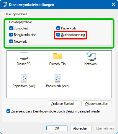 Da wir die Systemsteuerung in diesem Text mehrmals aufrufen werden, lohnt es sich ev. eine entsprechende Programmverknüpfung auf dem Desktop zu verankern mittels Einstellungen > Personalisierung > Designs > Desktopsymboleinstellungen (s.r.; rot markiert). Die anderen auf dem Desktop darstellbaren Systemordner sind grün markiert.