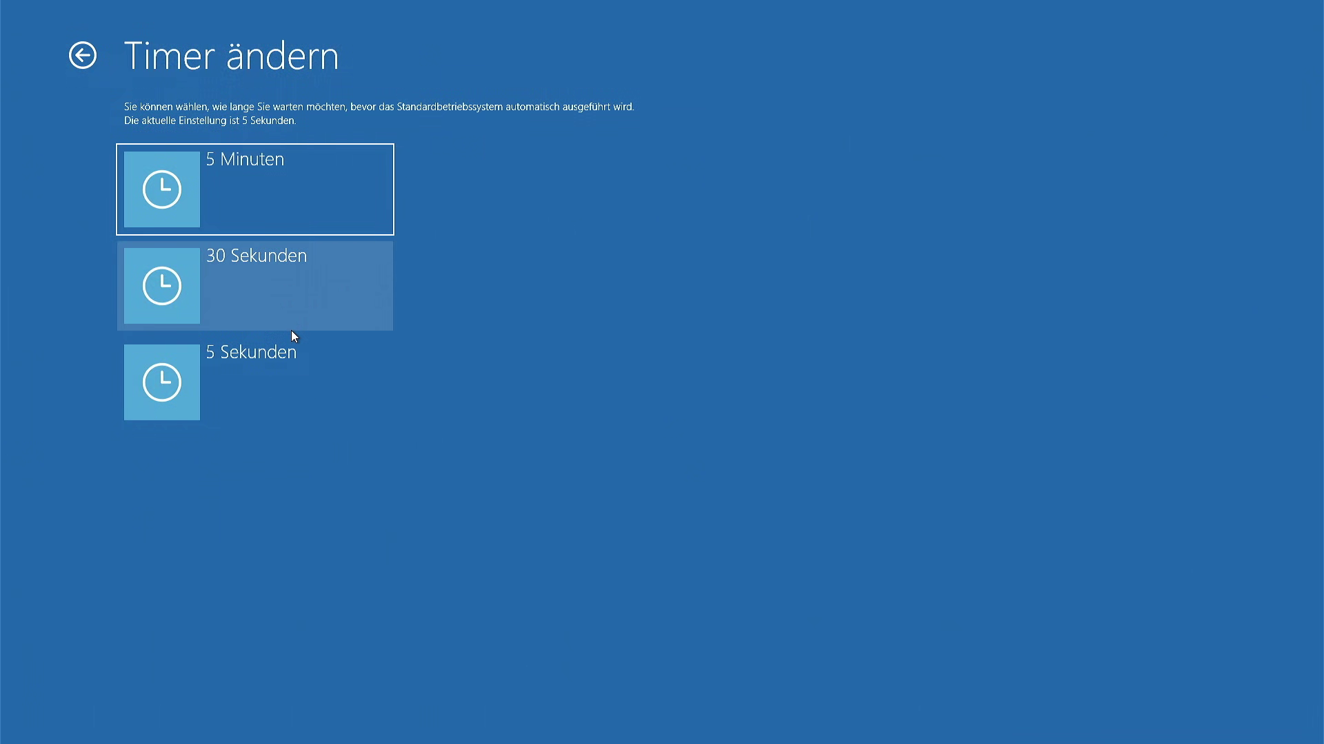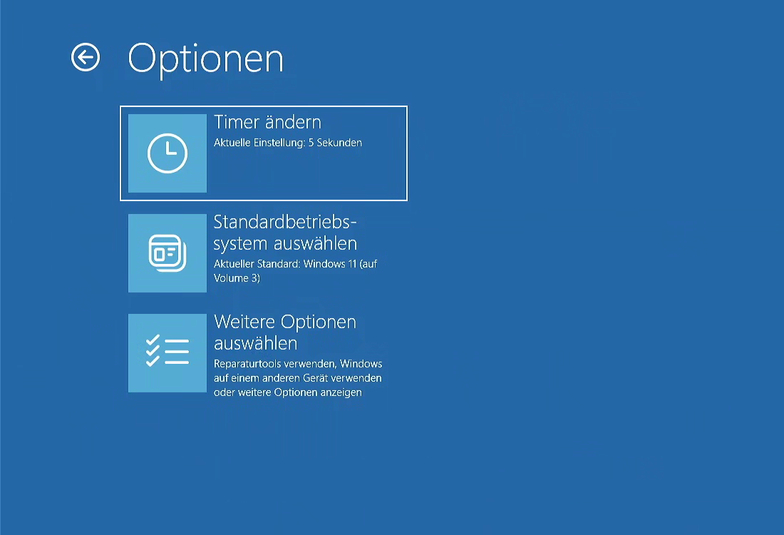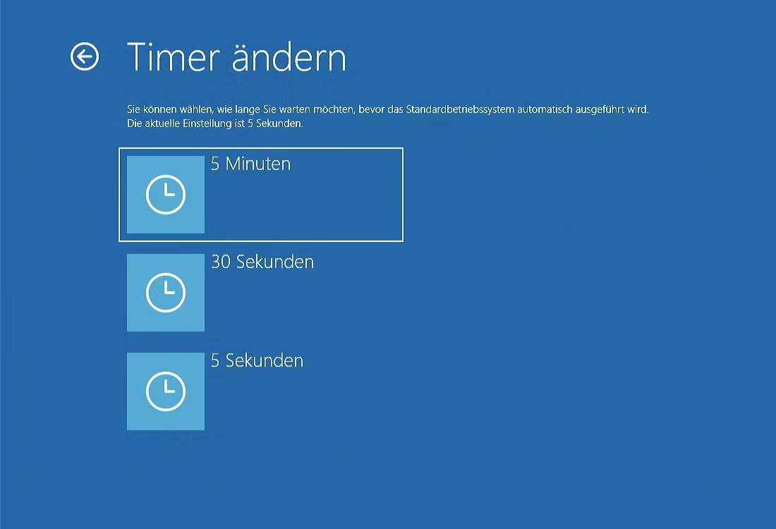- In den Optionen (s.m.u.) können Sie den Timer einstellen, der nach der abgelaufenen Zeit das Standardbetriebssystem startet.