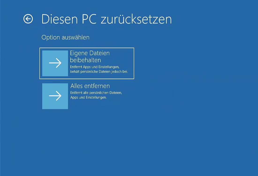 Sie können unter fünf (weiteren) Optionen auswählen (s.r.u.): Die Problembehandlung (s.o.) bietet das Zurücksetzen des PCs/Betriebssystems (s.l.u.) und Erweiterte Optionen.