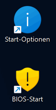 Start-Optionen Zur Erstellung einer derartigen Verknüpfung (Bsp.: Start-Optionen) rufen Sie im Kontextmenü des Desktops auf Neu > Verknüpfung und geben im ersten Fenster den roten Text ein (s.l.u.) und nach Weiter im nächsten den grünen Text (s.r.u.). Nach Fertig stellen der Verknüpfung rufen Sie über deren Kontextmenü die Eigenschaften auf (s.l.o.) und suchen über Anderes Symbol … ein geeignetes Icon aus (blau markiert). Die anderen Verknüpfungen erstellen Sie am schnellsten mittels Copy und Paste aus der eben erstellten: Erstellen Sie eine Kopie und benennen die um in z.B BIOS-Start, öffnen Sie dann die Eigenschaften der neuen Verknüpfung und ändern die Parameter z.B. in /r /fw /t 5 /c "zum UEFI/BIOS". Wählen Sie ein Anders Symbol.
