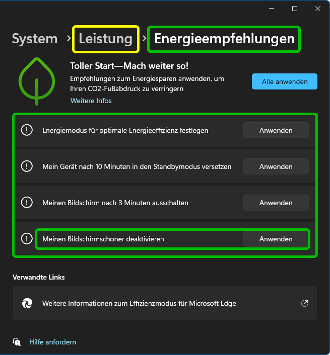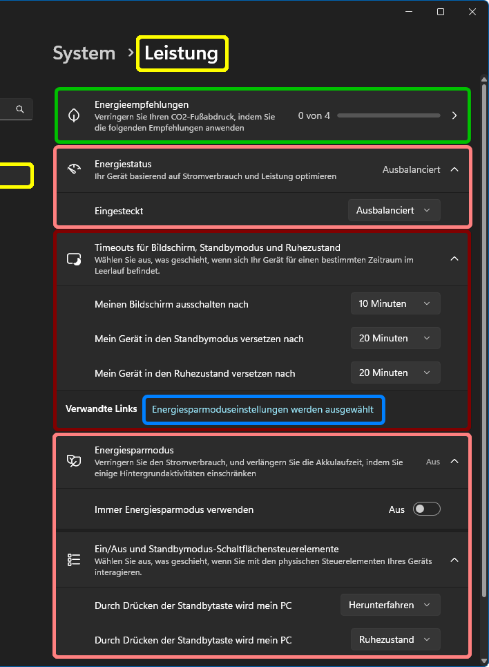 Und durch Anhaken von In W11 rufen Sie die Energiesparoptionen über Einstellungen > System > Leistung auf (s.u.). Dort sind auch die TimeOut-Einstellungen zu finden (braun markiert). Aber alle Einstellungen folgen der MS-Logik Simple Speech. Also werden die Begriffe Standbymodus, Ruhezustand, usw. nicht erklärt, was an den aufgeklappten Menüs gut zu erkennen ist (s.r.). Und wenn man dort den verwandten Link Energiesparmoduseinstellungen werden ausgewählt, landet man nicht bei den Systemeinstellungen, sondern bei MS im Netz, wo dann ein nicht existierender Programmpfad angeboten wird (W11 24H2, Nov.24). Dafür gibt es nun Energieempfehlungen (grün markiert).