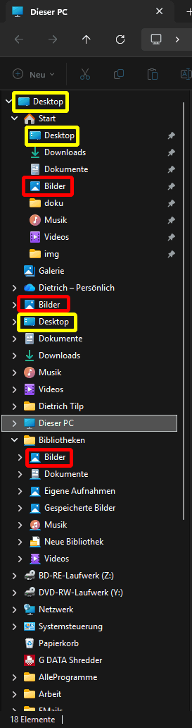 Das ist für altgediente PC-Freaks äußerst gewöhnungsbedürftig, denn unterhalb dieses (logischen) Desktops hat MS den Einstiegspunkt "Dieser PC" verortet, aber im PC sind nun mal physikalisch als oberste Ebene die Laufwerke angesiedelt und sonst nichts. Außerdem gibt es ja einen realen Desktop, nämlich den auf dem Bildschirm (als Hintergrundfenster) und auf diesem Desktop sind mitnichten alle Daten abgelegt, obwohl durchaus einzelne Programme/Dateien/Ordner dort abgelegt werden können (Zettelkasten). In diesem Sinne ist dieser Desktop nichts anderes, als unter vielen anderen der spezielle Ordner C:\Users\nnn\Desktop\, also auf dem Laufwerk C:, der eben in einem besonderen Fenster (dem vollformatigen und randlosen Desktop-Fenster) dargestellt wird. Das wiederum bedeutet, dass die Benutzerordner Dokumente, Bilder, usw. irgendwo im Ordnerbaum eingebunden sein müssen und daher eigentlich keinen schnellen Zugriff bieten. Dokumente z.B. ist u.U. der Ordner C:\Users\nnn\Documents\ und Bilder liegen u.U. in C:\Users\Public\Pictures\.
