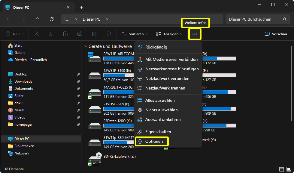 Die pink markierten Optionen (s.r.o.) werden in 9. Datenschutz abgehandelt. Unter W7 hieß Dieser PC noch Arbeitsplatz. Damals gab es die Verknüpfungslisten Biblitheken, die unter W10 aus Kompatibilitätsgründen noch bedienbar sind, aber eigentlich durch die Verknüpfungslisten Schnellzugriff abgelöst wurden. Daher kann man unter W10 zwischen der Darstellung Dieser PC und der Darstellung Schnellzugriff wählen. Das sind aber nur Einstiegspunkte zu den vier Gruppen Schnellzugriff, Onedrive, Dieser PC und Netzwerk im Navigationsbereich (s.r.). D.h. es werden immer alle vier Bereiche angezeigt, aufgeklappt oder nicht, aber immer durch rauf- und runtrscrollen erreichbar.