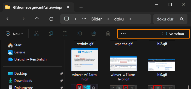 Im Bsp. (s.o.) ist gerade der Bilderordner doku aus der Bibliothek Bilder ausgewählt. Dessen Brotkrumenpfad lautet daher: Das Bild bl2.gif ist aktiviert und wird daher im Vorschaufenster angezeigt (gelb markiert). Die Grenze zwischen den beiden Fenstern kann verschoben werden (hellblau markiert).