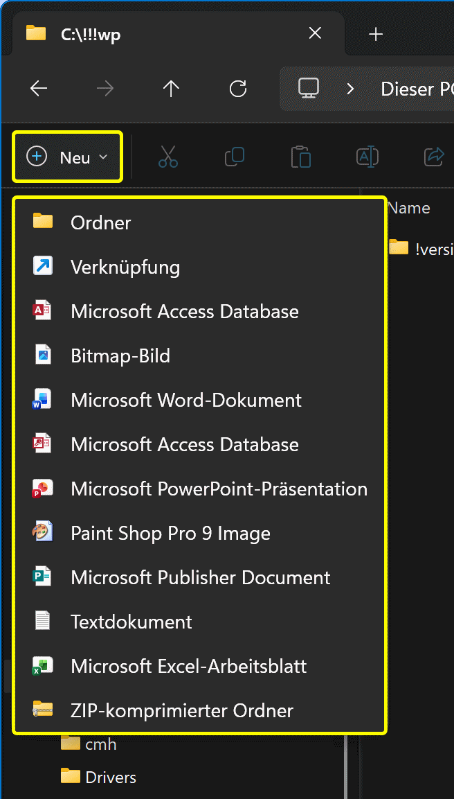 Wird im Navigationsbereich ein Ordner markiert, öffnet sich nach Klick in der Befehlszeile auf Neu ein Fenster