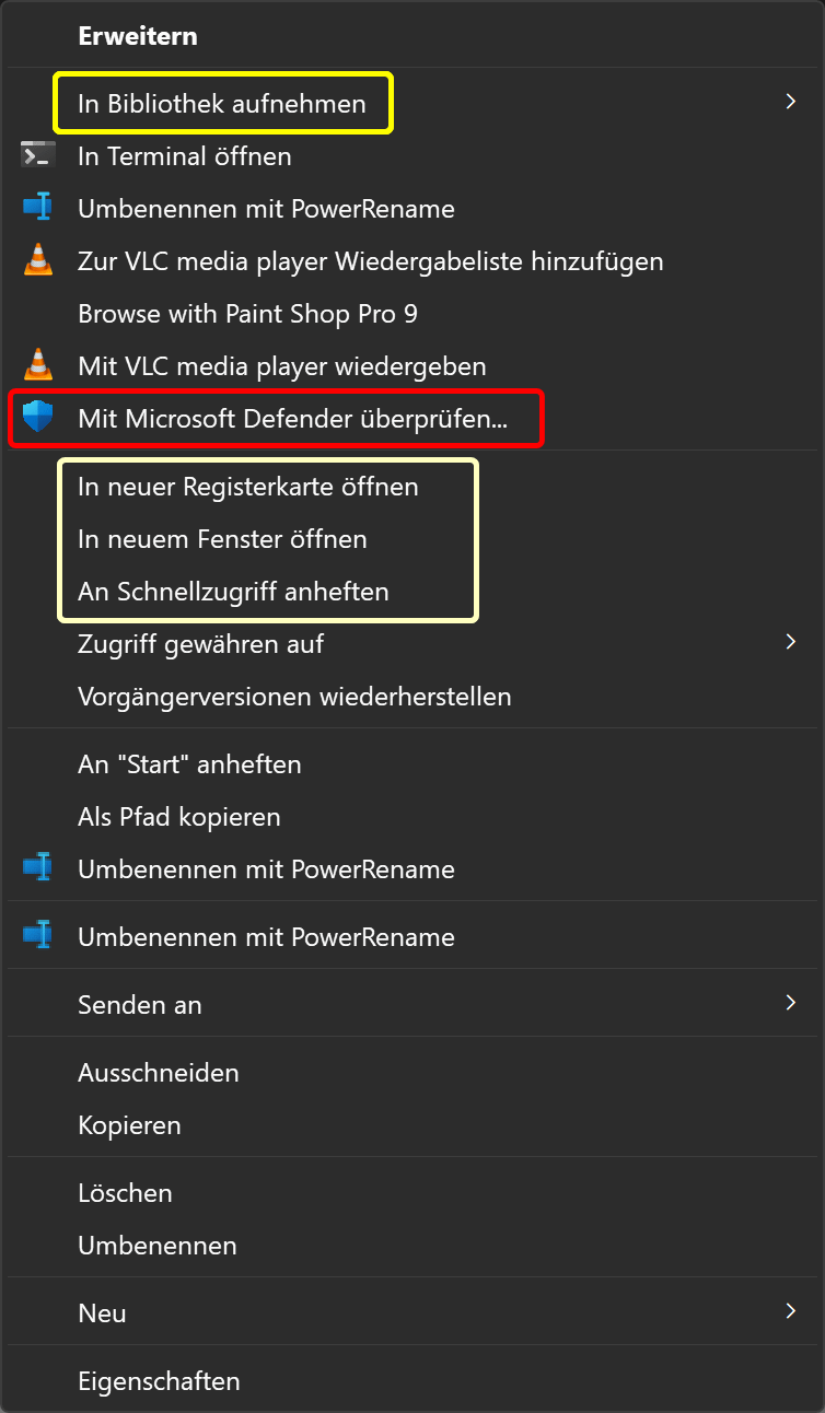 So können Sie in einem Explorer-Fenster mit mehreren Ordnern arbeiten, verteilt auf mehrere Registerkarten/Tabs. Neue Registerkarten öffnen Sie durch Klick auf + in der Registerzeile oder mittels Strg + T , wobei der Ordner jeweils in der neuen Registerkarte geöffnet wird. - In neuem Fenster öffnen ... - An Schnellzugriff anheften ... - Komprimieren in ... - In Bibliothek aufnehmen ... - Mit MS Defender überprüfen … ... ∘ Sortieren im Inhaltsbereich