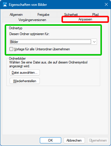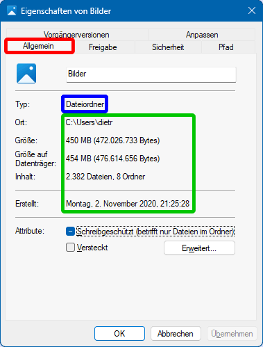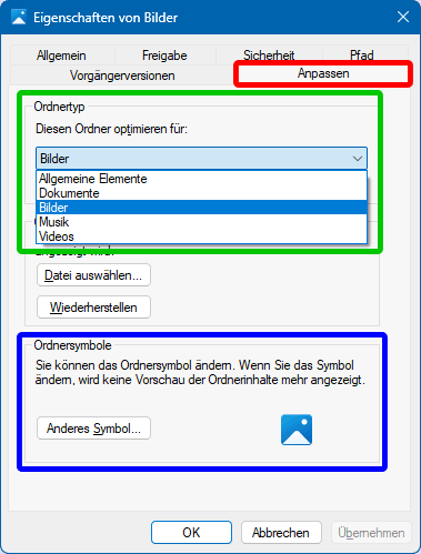 Mögliche Ordnertypen sind Allgemeine Elemente, Dokumente, Bilder, Musik und Videos. Über die Eigenschaften eines Ordners (Rechtsklick -> Eigenschaften) kann dessen Ordnertyp festgelegt/geändert werden (s.r.a.; grün markiert). Im Bsp. wurde der Ordner Bilder untersucht, der in C:\Users\dietr liegt, wie der Karteikarte Allgemein zu entnehmen ist. Auf der Karteikarte Pfad ist genauer ablesbar: C:\Users\dietr\Pictures. Beides zeigt, dass im System mit englischen Begriffen gearbeitet wird und nur der Explorer (nicht aber andere Dienste) auf die jeweilige Landessprache übersetzt.