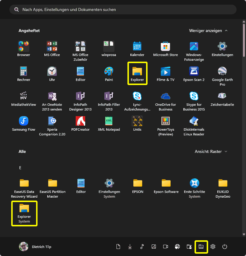 Aber natürlich kann der Explorer auch über die Taskleiste gestartet werden, wenn er dort abgelegt ist. Und natürlich kann er auch über das Startmenü gestartet werden, dort ggf. sogar auf dreierlei Arten (s.l.; gelb markiert): sicher immer über die Liste aller Apps, nur falls angeheftet auch über die Apptabelle und ggf. auch unten über die Ordnersymbole neben dem Netzschaltersymbol. In der Liste aller Apps oder über die Apptabelle kann der Explorer über sein Kontextmenü (Rechtsklick) an den Start und an die Taskleiste geheftet oder davon gelöst werden (s.r.). Und durch Rechtsklick in einen freien Bereich werden die Starteinstellungen (= Personalisierung > Start) aufgerufen (s.r.o.). Dort kann die Abteilung Andere > Ordner geöffnet werden, in der die Apps ausgewählt werden können, die unten neben dem Netzschaltersymbol eingeblendet werden sollen.