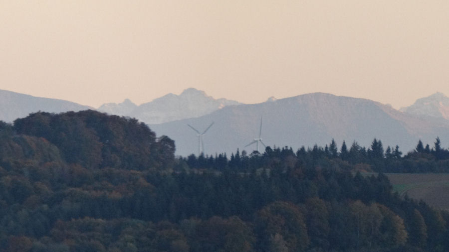 Die Wurzacher Windräder sind nur halb so hoch wie die Schellenberger, daher verschwinden sie fast vor den mächtigen Alpen.