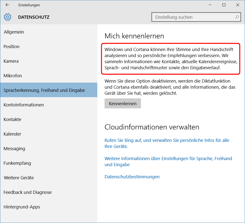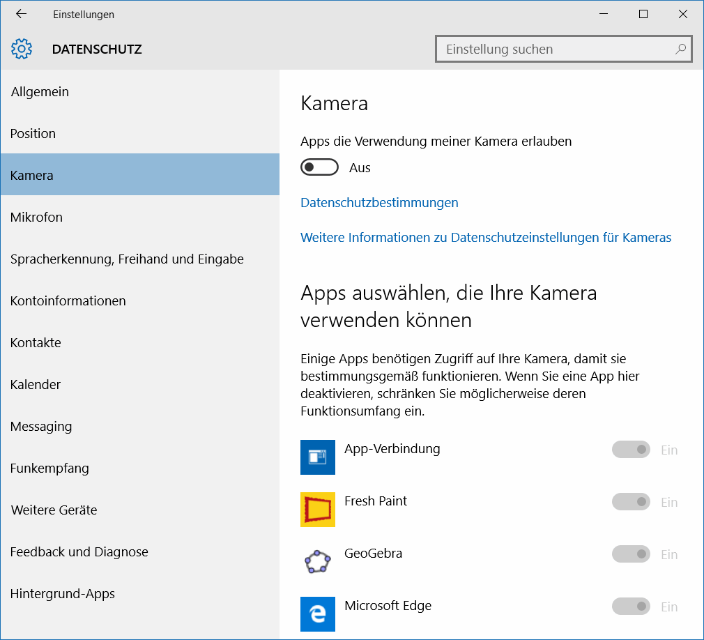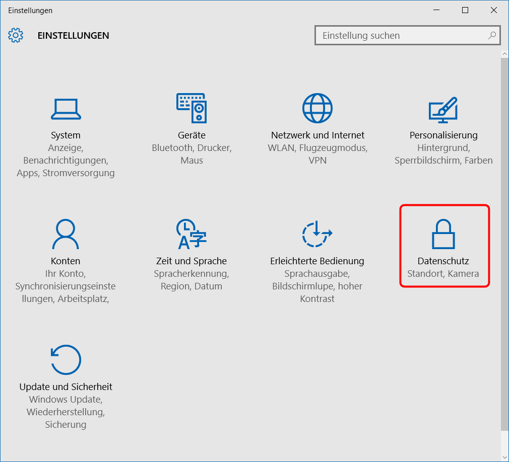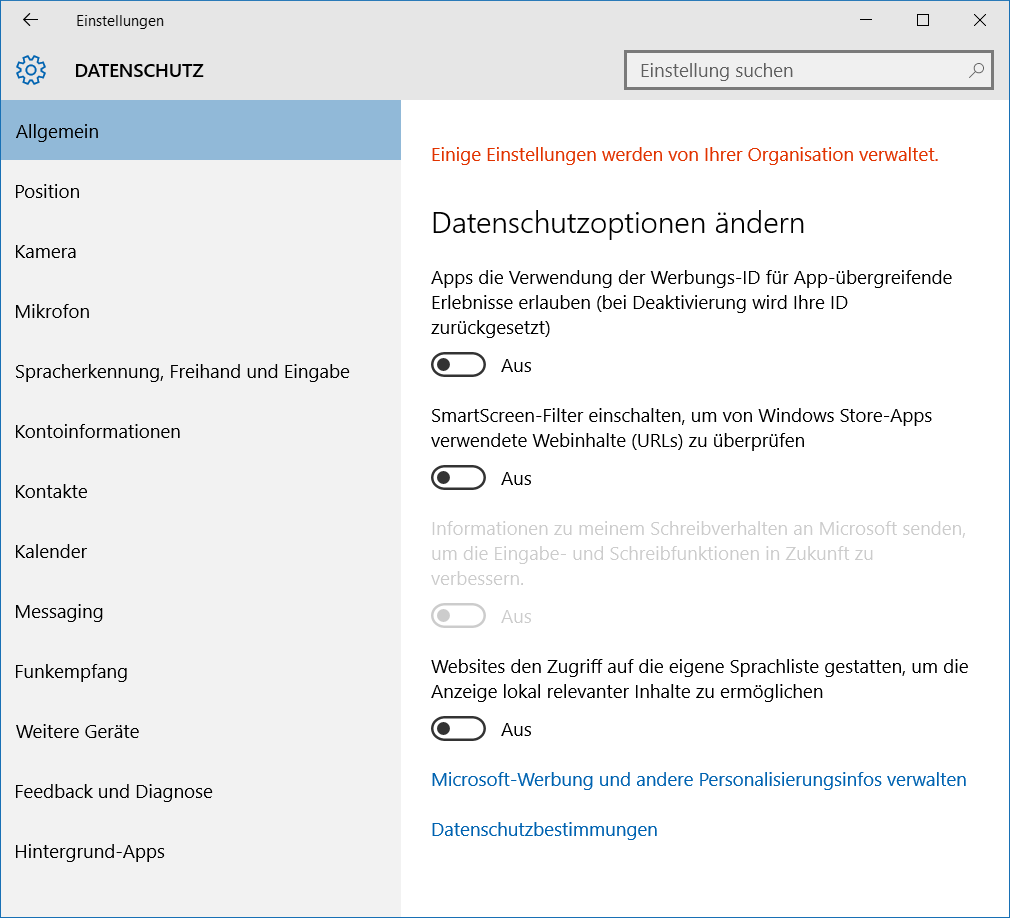 Im vorliegenden Abschnitt werden Datenschutz und Personalisierung abgehandelt. Im folgenden Abschnitt Unter Datenschutz nach außen ist die Kontrolle über die den PC verlassenden Daten und über die Infiltration des PCs von außen zu verstehen. Eine aktivierte Firewall und ein aktivierter Virenscanner sind selbsverständliche Voraussetzung für den Schutz von/nach außen. In letzter Zeit sind erschreckend viele IT-Dienstleister von Hackern kompromittiert worden und Kundendaten abhanden gekommen. Sie müssen also selbt entscheiden, ob, und wenn ja, welche Daten Sie selbst nach außen geben wollen, welche Apps welche Daten nach außen geben sollen, von außen hereinlassen sollen und wem Sie von außen Zugriff auf Ihre Daten erlauben wollen. • MS-Dokumentation zum W10-Datenschutz
