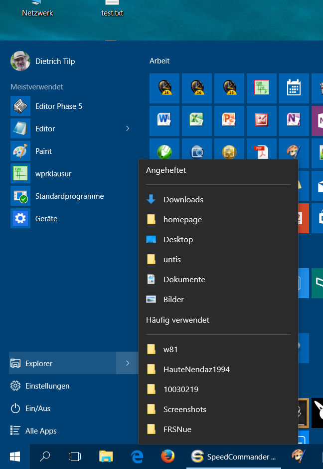 Sprunglisten können im Startmenü (s.l.o.) und in der Taskleiste (s.u.) auftreten. Im Dienst Einstellungen > Personalisierung > Start können Sie Zuletzt geöffnetete Elemente in Sprunglisten im Menü "Start" oder auf der Taskleiste einschalten zulassen oder unterbinden (s.r.o.). Sprunglisten ermöglichen zügiges Arbeiten, vor allem von Powerusern. Aber wer sonst noch Zugang zum Dektop hat, kann der Reihe nach alle Sprunglisten öffnen und so "forensische" Erkenntnisse über die Bildschirmarbeit des Users erhalten.