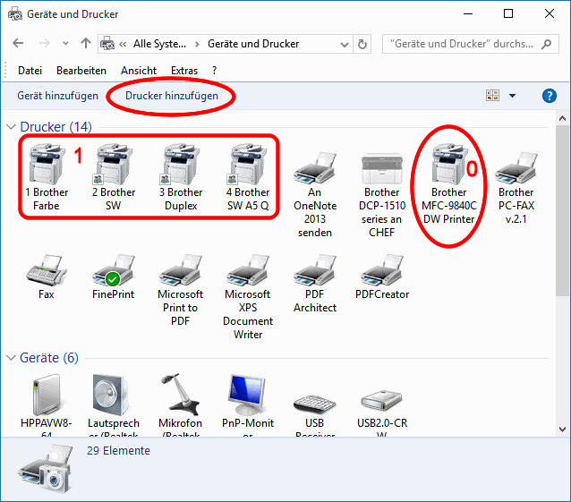 • Mehrfachinstallation/Klonen des vorhandenen Druckers (Systemsteuerung)Setzt man z.B. einen duplexfähigen Multifunktionsdrucker ein, muss man für jeden Auftrag ggf. die Druckeinstellungen aktualisieren. Das kann im Alltagsstress schon mal schief gehen. Denn für Druckaufträge kann zwischen folgenden Einstellungen gewählt werden: DIN A4/A5, Format Hoch/Quer, Farbe/Schwarzweiß, simplex/duplex/Brochur, Normalpapier/Karton, Auflösung Entwurf/Hoch, usw. Besonders kritisch scheint die Papierart zu sein. Das Tonerpulver wird nämlich bei Temperaturen von 170° bis 200° ins Papier eingebrannt und diese Fixiertemperatur ist papierabhängig. D.h., z.B. für Einladungen sollte in den Druckeinstellungen schweres Papier oder Karton eingestellt werden. Andernfalls lässt sich der Toner später vom Papier rubbeln. Eine diesbezügliche Fehleinstellung merkt man meist erst, wenn der ganze Druckauftag abgearbeitet ist. Wenn man nun den Drucker dauerhaft auf Karton einstellen würde, würden dünnere Papiere beim Fixieren u.U. wellig werden. Vor allem, wenn im Laufe eines Arbeitstages derartige Formate im Wechsel gedruckt werden müssen, schafft u.U. die Mehrfachinstallation des vorhandenen Druckers Abhilfe. Alle Installationen verwenden dieselben Druckertreiber und damit dieselben Eigenschaften, aber jede Installation wird mit anderen Einstellungen versehen und entsprechend benannt. (s.o. , 1). Dazu müssen Sie im Dienst Geräte und Drucker (s.o.) auf Drucker hinzufügen klicken. Dann sucht Windows nach angeschlossenen Druckern; falls keine gefunden werden, aktivieren Sie "Der gewünschte Drucker ist nicht in der Liste enthalten" und dann "Mein Drucker ist etwas älter, ich brauche Hilfe" (Windows 10). Dann wird der Drucker gefunden und kann ausgewählt werden. Geben sie dem Drucker einen neuen (sprechenden) Namen. Im Beispiel oben wurden auf diese Weise vier Klone erzeugt und so benannt, dass sie später in der Druckerliste in der gewünschten Reihenfolge aufgelistet werden. Für jeden der Klone rufen Sie zuletzt den Dienst Druckeinstellungen auf. Der ist bei Klonen anders aufgebaut (s.u.). Dort stellen Sie nun das jeweilige Druckerverhalten ein.