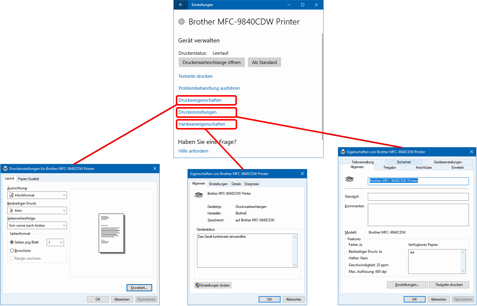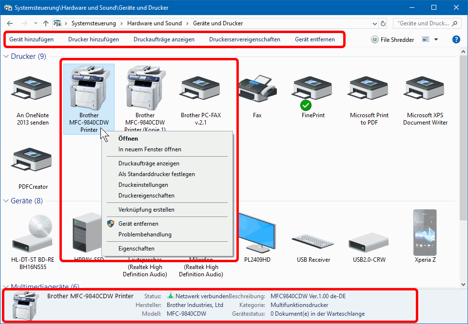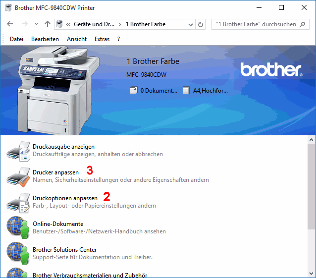 Den Einstellungsdienst für installierte Drucker finden Sie in Geräte und Drucker (s.r.), in W7 im Startmenü, in W8/10 unter Systemsteuerung oder unter Einstellungen > Geräte. Im Beispiel sehen Sie den Multifunktionsdrucker Brother MFC-9840CDW (0) samt einiger Klone (1). Im Kontextmenü der Drucker (s.u.) sind die Windows-Dienste 2 - 4 aufrufbar und über (In neuem Fenster) Öffnen oder nach Doppelklick auf das Druckersymbol kommen die Hersteller-Dienste (s.r.u.).