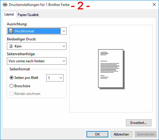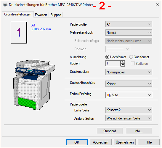 Dienst 3 Druckereigenschaften (Brother: Drucker anpassen) dient der Festlegung der Hardware des Druckers; wieviele Schächte, welche Papier-Formate, Farbe/SW, Auflösung usw.. Ferner legen Sie hier die Druckerfreigabe fest, bestimmen die Druckeranschlüsse, die Spoolereigenschaften usw.. Dieser Dienst wird nur bei der Installation und bei eventuellem Ausbau des Druckers benötigt. Dienst 2 Druckeinstellungen (Brother: Druckoptionen anpassen) dient der Einstellung für den aktuellen Druckauftrag. Hier wechselt man also zwischen Farbe und Schwarzweiß, A4 und A5, Duplex und Simplex, usw.. Unten sind die beiden Dienste dargestellt. Links kann man durch direktes Anklicken jeden der drei Papier-Schächte aktivieren. ![]()