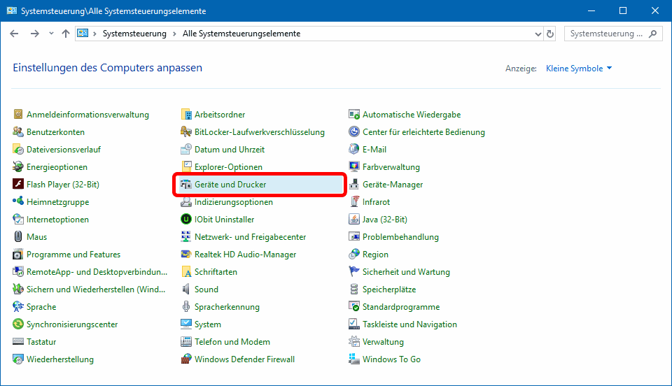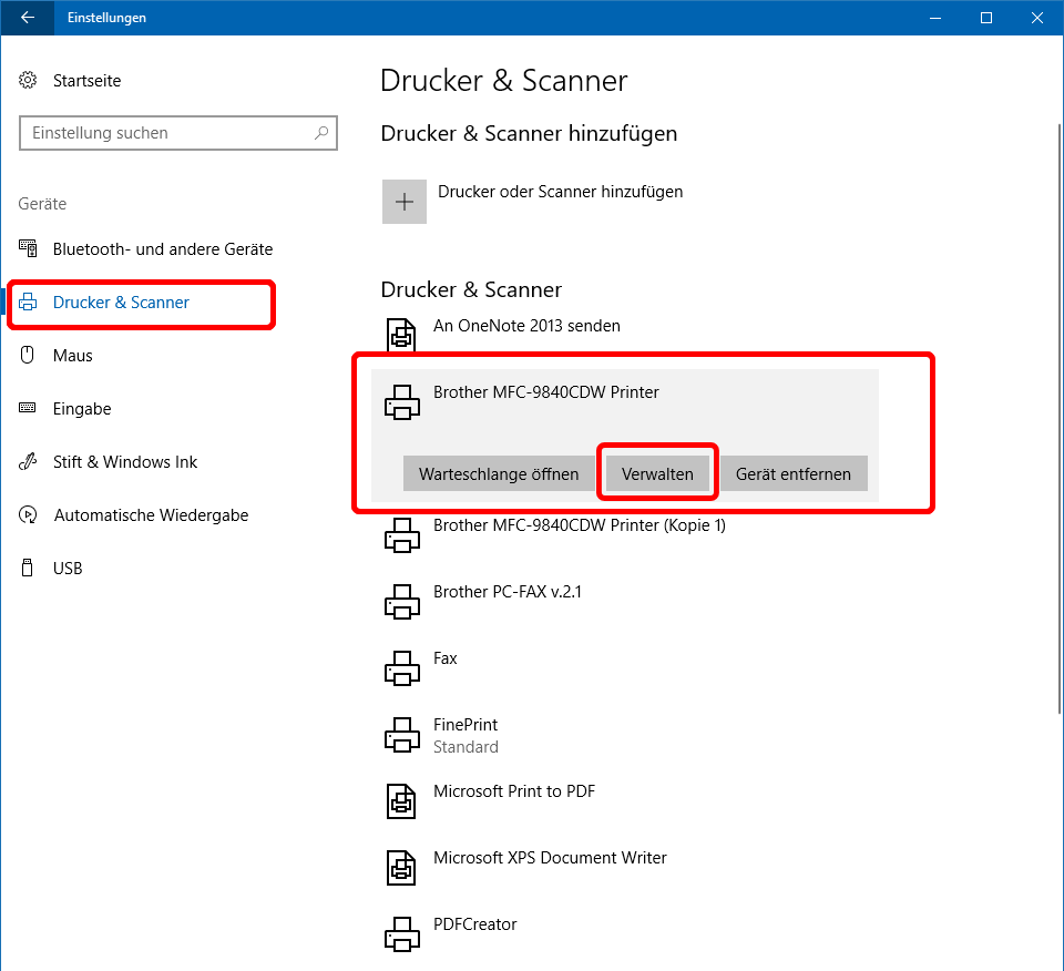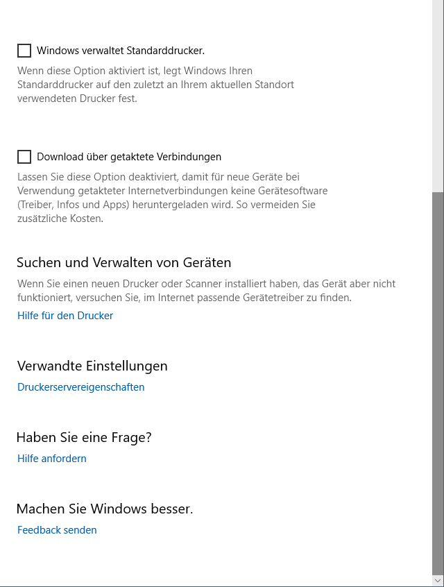 Im Abschnitt • Einstellungen vs. SystemsteuerungVersion 1709 zeigt noch schön, dass W10 noch lange nicht "ausdesignet" ist. Das Druckermanagement über Einstellungen unterscheidet sich deutlich vom noch vorhandenen über die Systemsteuerung. Wenn das W10-Druckermanagement über Einstellungen > Geräte geöffnet wird, ergibt sich das folgende Bild (s.u.). Je nach Fenstergröße ist der Inhalt auf ein oder mehrere Fenster veteilt; die Darstellung kann also unterschiedlich sein. Im Bsp. ist ein Drucker aktiviert. Nach Aktivieren von Verwalten öffnet sich das zugehörige Verwaltungsfenster (s.u.). Wenn das W10-Druckermanagement über Systemsteuerung > Geräte und Drucker geöffnet wird (s.u.), ergibt sich eine optisch ganz andere Bedienerführung (s.w.u.).