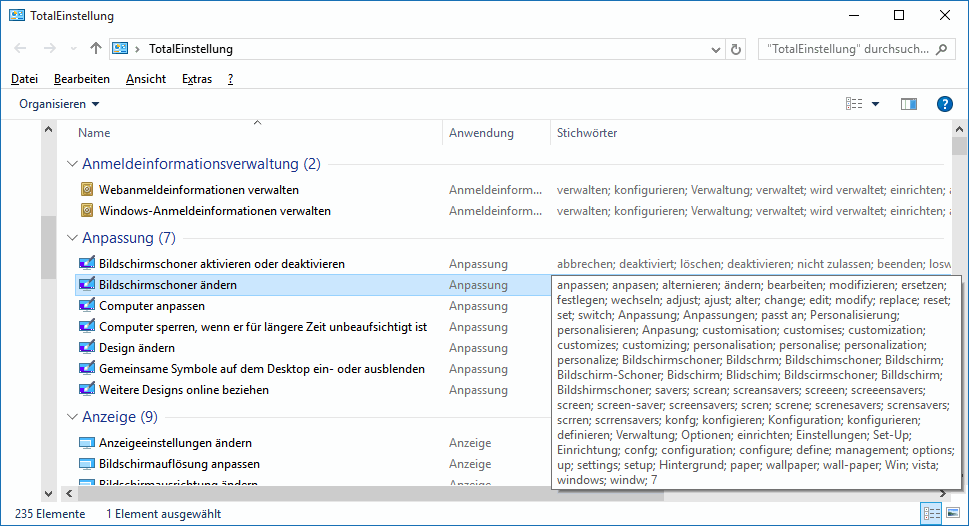 Der Name ist frei wählbar, aber die Endung ab Punkt muss identisch angegeben werden. Der neue Ordner ist "fiktiv" und wird automatisch mit dem Systemsteuerungs-Symbol gekennzeichnet (s.r.). Weil der Ordner fiktiv ist, kann er nur durch direktes Anklicken auf dem Desktop oder über den Explorer "geöffnet" werden. Wird er mittels (privatem) Dateimanager geöffnet, wirkt er wie ein normaler Ordner, der auch normal gefüllt werden kann, von dort aus aber nicht die Spezialfunktionalität hat. ![]() Oben ist die TotalEinstellung in zwei Ansichten vorgestellt. Nicht jeder der über 200 Einträge führt zu einem eigenen Einstellungsdialog; mache öffnen die gleichen Einstellungsfenster, andere öffen den Browser mit Lösungsvorschlägen. Die Darstellung lässt sich unterschiedlich anzeigen, gruppieren und sortieren. Im Bild oben passen so alle 245 Einträge alphabetisch in ein 1920x1080-Fenster (bei 100%-Anzeigeeinstellung), wobei die tatsächliche Anzahl von der Ausstattung des jeweiligen PCs abhängt. Bei gruppenweiser Darstellung sind die Einträge auf 39 Gruppen verteilt: