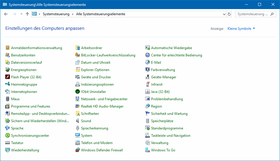 8. PC-Steuerung und -Einstellungen![]() ![]() ![]() ![]() • Gegenüberstellung: W10- und W7-SchemaBis auf weiteres gibt es das W7-Schema Systemsteuerung und das W10-Schema Einstellungen. Langfristig sollen wohl alle Einstellungsmenüs in das W10-Schema überführt werden. D.h. mit jeden W10-Funktionsupdate verändert sich das "Bild". Unten ist als Momentaufnahme der Stand 1709 dargestellt. Die Systemsteuerung weist derzeit acht Kategorien auf (s.r.o.), das Menü Alle Einstellungen dagegen dreizehn (s.l.o). Wechselt man in der Systemsteueung zur Symbol-Anschicht (im Bsp. Kleine Symbole; s.u.), dann findet man 45 Rubriken. Weiter unten werden 39 Rubriken aufgelistet.