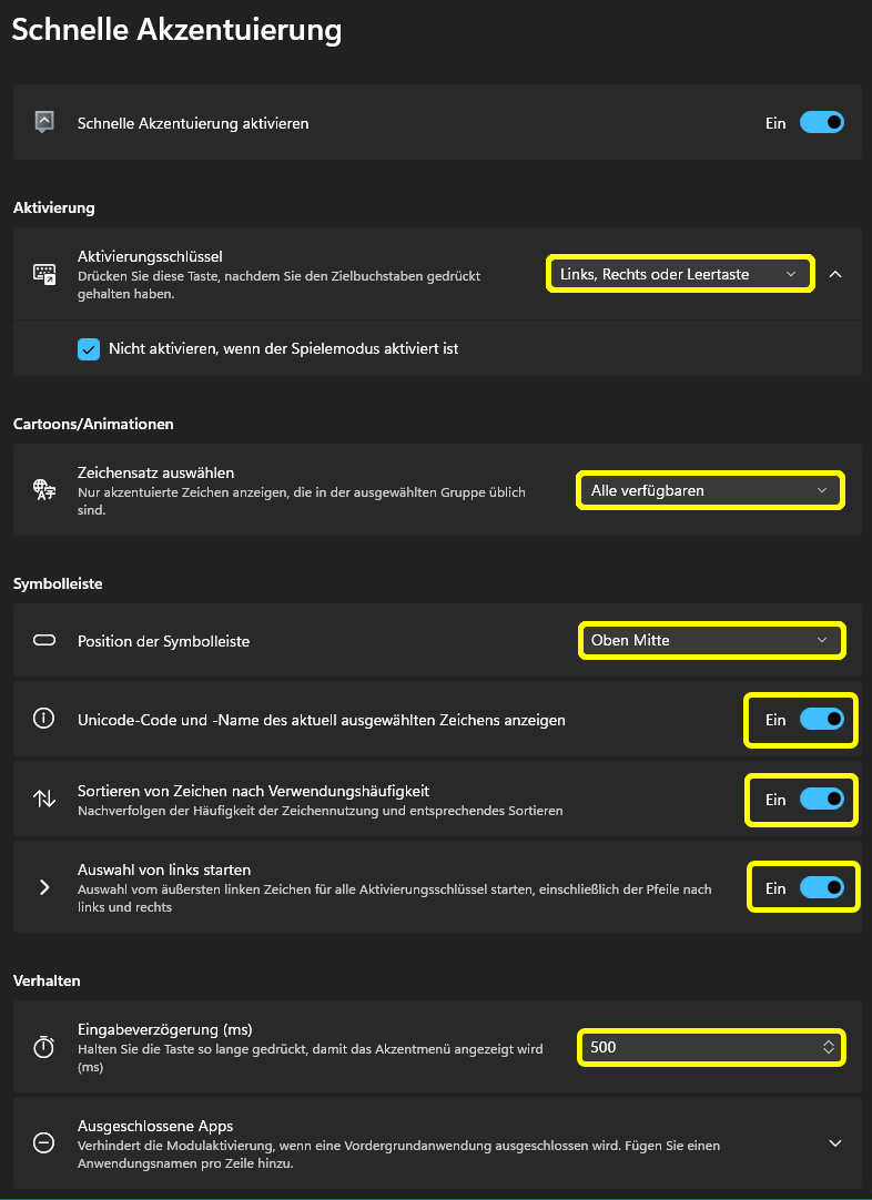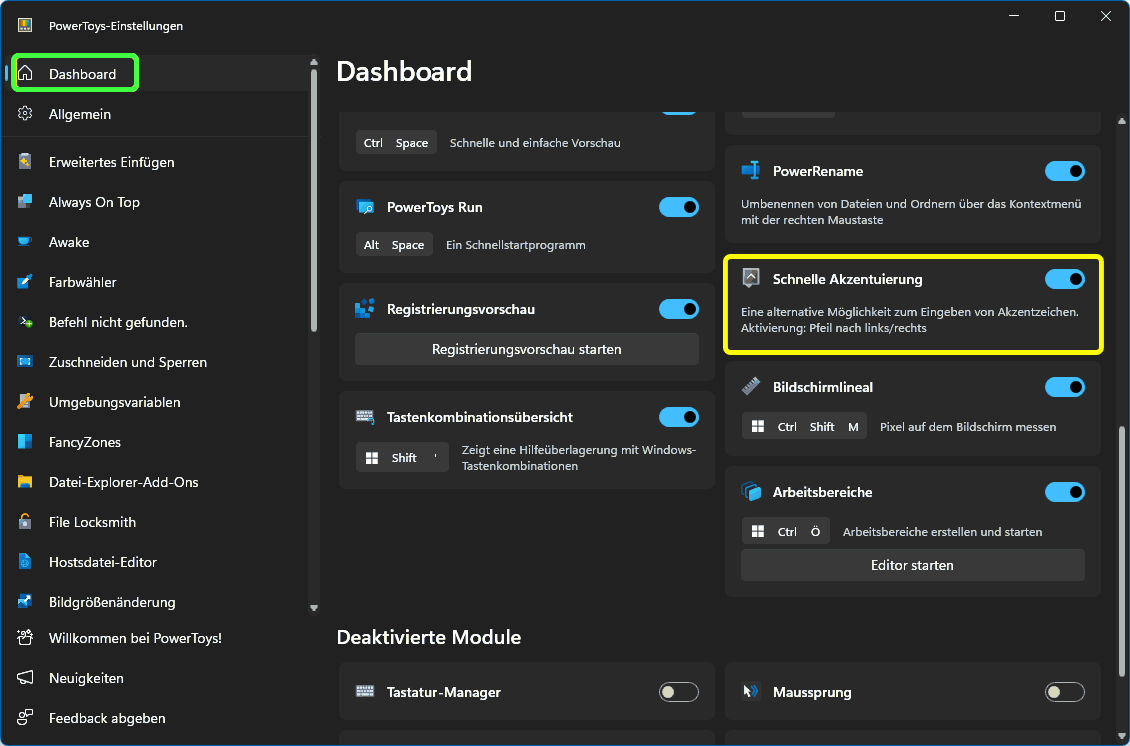 So fehlen u.a. bei a die Buchstaben å ă æ ą und bei c alle kombinierten Buchstaben ć č ç und bei s alle kombinierten Buchstaben c) Schnelle Akzentuierung mit PowerToys Das Tool Schnelle Akzentuierung (Quick Accent) kann in W11 als Ersatz für die vermurkste Bildschirmtastatur II verwendet werden.