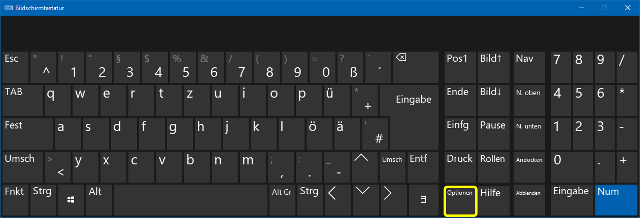 Der Nummernblock kann über Optionen (gelb markiert) hinzugeschaltet werden. Dann entspricht I einer klassischen Hardware-Tastatur. Sie kennt daher ebenfalls nur die in