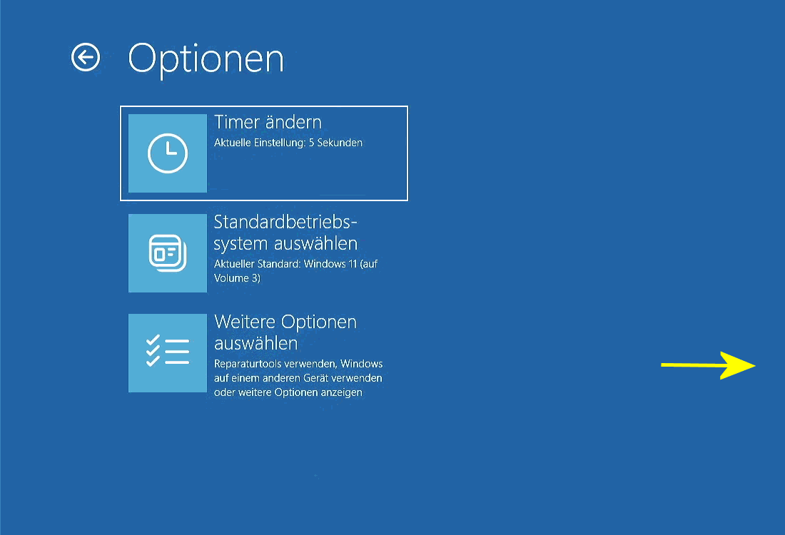 - In den Optionen (s.m.u.) können Sie den Timer einstellen, der nach der abgelaufenen Zeit das Standardbetriebssystem startet.