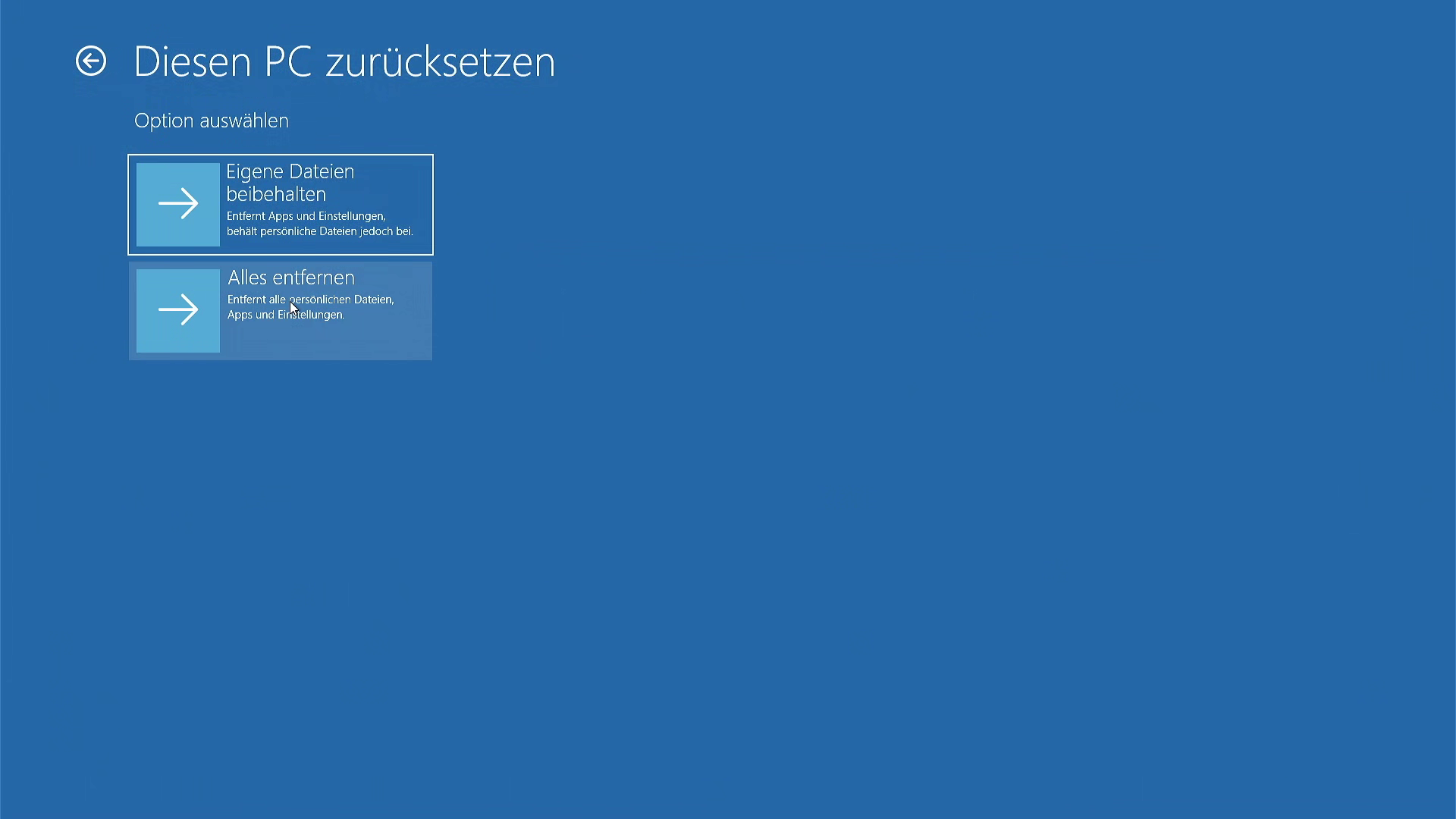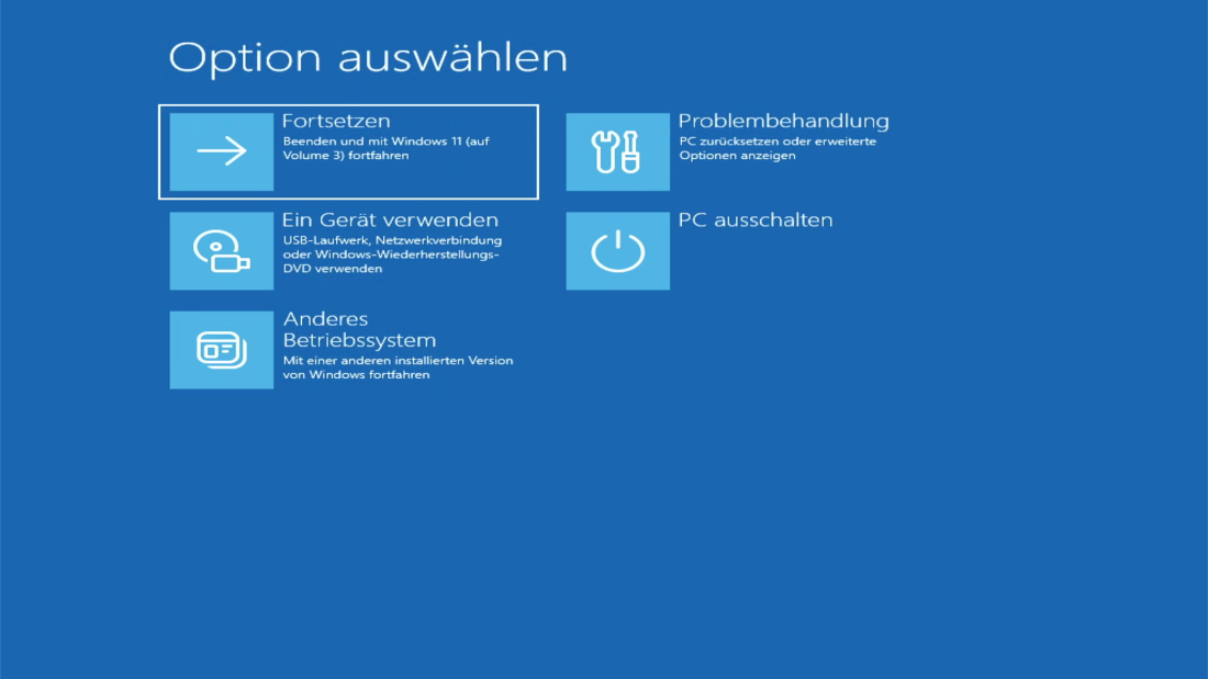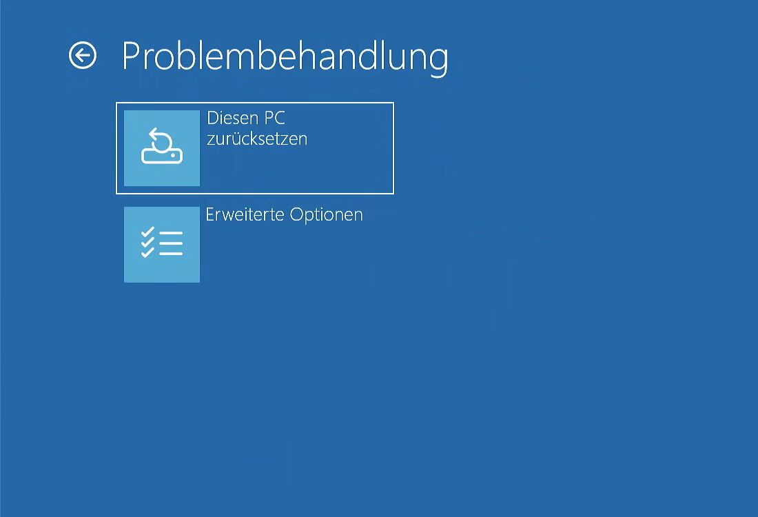 Sie können unter fünf (weiteren) Optionen auswählen (s.r.u.): Die Problembehandlung (s.o.) bietet das Zurücksetzen des PCs/Betriebssystems (s.l.u.) und Erweiterte Optionen.