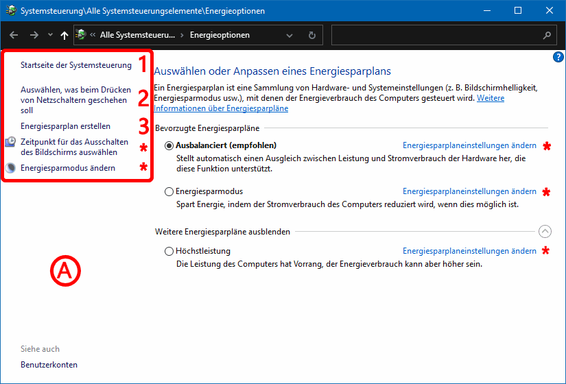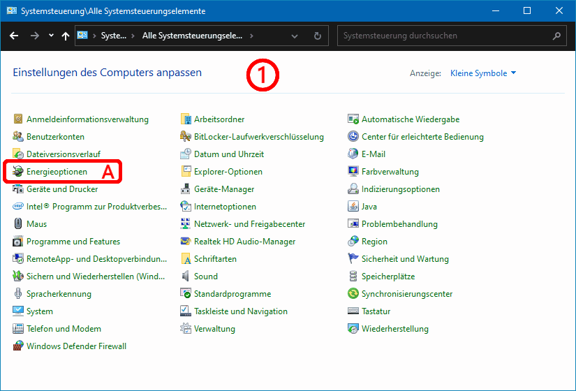 Und dort wählen Sie Zusätzliche Energieeinstellungen (rot mit A markiert). Dadurch öffnet sich das alte, schon von W7 her bekannte Fenster Energieoptionen (s.r.u.; ebenfalls mit A markiert). Dort ist folgerichtig über den Punkt 1 (s.r.u.) das alte Menü Systemsteuerung \ Alle Systemsteuerungselemente\ aufrufbar (s.u.): MS hat also bisher die alte Systemsteuerung immer noch nicht vollständig auf das moderne Einstellungsmenü von W10 umgestellt, obwohl die alte Struktur manche Ungereimtheiten aufweist. Nachdem bereits W11 veröffentlicht ist, steht nicht zu erwarten, dass sich in W10 hier noch wesentliches ändern wird. Die weiteren Fenster können je nach PC-Typ unterschiedlich ausfallen. Nebenstehend sind die Energieoptionen eines modernen Desktop-PCs dargestellt (s.r.; mit A markiert).