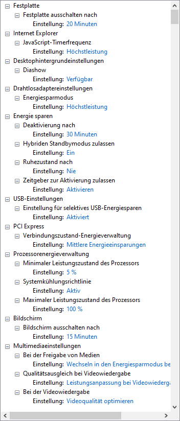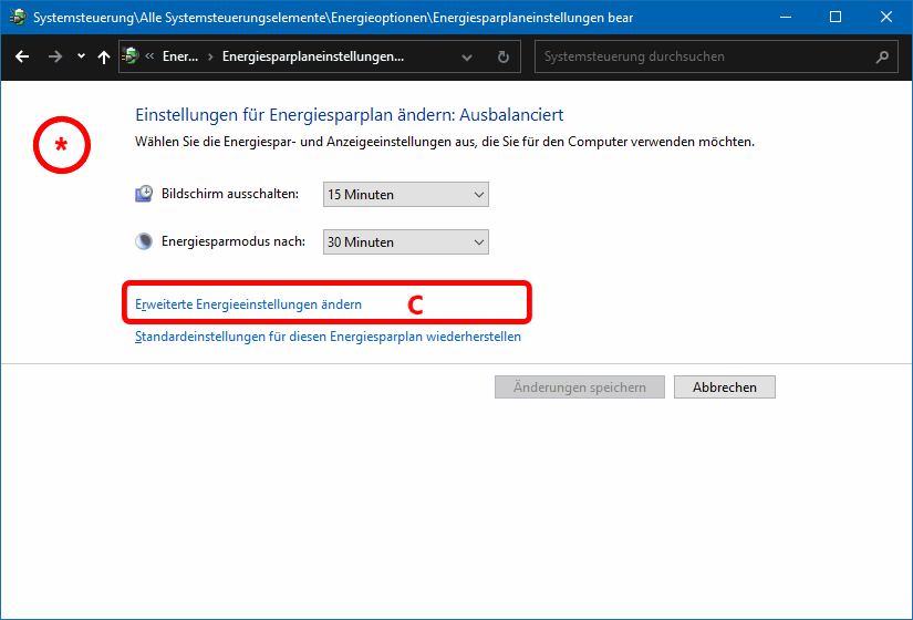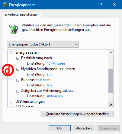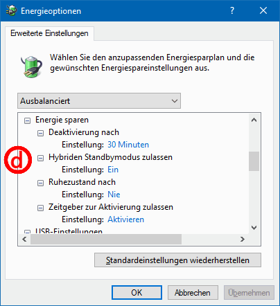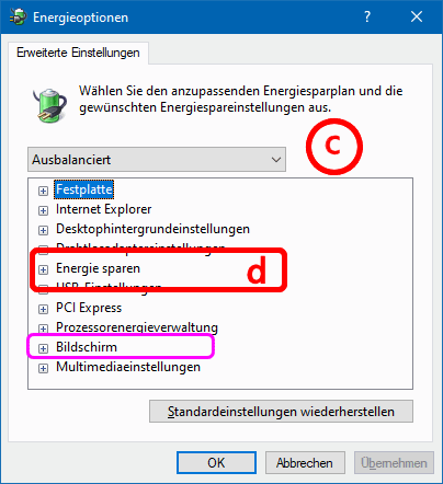 Aber anhand des Fensters Energiesparplaneinstellungen können Sie gut nachvollziehen, was aus Sicht von MS geeignete Einstellungen sind (s.r.u., Für die drei Standard-Energiesparpläne Ausbalanciert, Energie sparen und Höchstleistung werden im Folgenden die jeweils von MS vorgedachten Standard-Energieoptionen vorgestellt. Über Standardeinstellungen wiederherstellen kommen Sie jederzeit zurück zum Standard. Am Energiesparplan Ausbalanciert sei das mit den folgenden drei Bildern erklärt: links sehen Sie alle 10 Energieoptionen für den gewählten Energiesparplan (c), in der Mitte den Ausschnitt Energie sparen (d) und rechts in einer Bildmontage alle aufrufbaren Optionen.