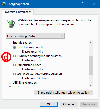 Es fällt auf, das der Ruhezustand nie aktiviert wird; an seiner Stelle wird immer der hybride Standby-Modus (= Schnellstart-Hybridmodus) aktiviert.