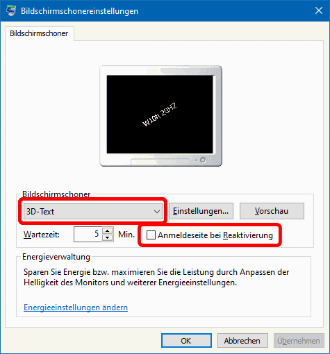 Ein Klick auf Einstellungen für Bildschirmtimeout öffnet in W10 das (alte) Menü Energieoptionen, das ausführlich im Ein Klick auf Einstellungen für Bildschirmschoner öffnet in W10 und W11 das von W7 her bekannte Fenster Bildschirmschonereinstellungen (s.r.u.).