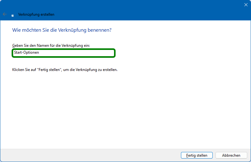 Start-Optionen Zur Erstellung einer derartigen Verknüpfung (Bsp.: Start-Optionen) rufen Sie im Kontextmenü des Desktops auf Neu > Verknüpfung und geben im ersten Fenster den roten Text ein (s.l.u.) und nach Weiter im nächsten den grünen Text (s.r.u.). Nach Fertig stellen der Verknüpfung rufen Sie über deren Kontextmenü die Eigenschaften auf (s.l.o.) und suchen über Anderes Symbol … ein geeignetes Icon aus (blau markiert). Die anderen Verknüpfungen erstellen Sie am schnellsten mittels Copy und Paste aus der eben erstellten: Erstellen Sie eine Kopie und benennen die um in z.B BIOS-Start, öffnen Sie dann die Eigenschaften der neuen Verknüpfung und ändern die Parameter z.B. in /r /fw /t 5 /c "zum UEFI/BIOS". Wählen Sie ein Anders Symbol.