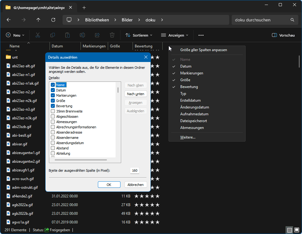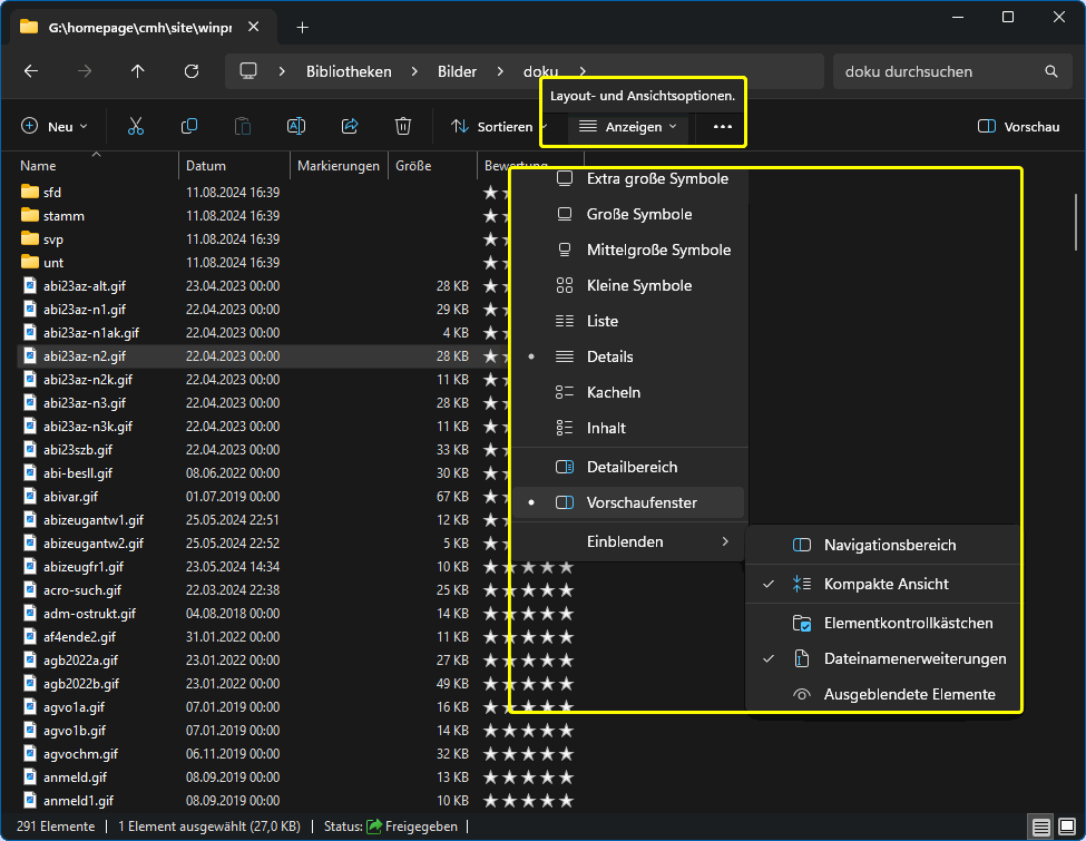 Über den Schalter Anzeigen stellen Sie die Layout- und Ansichtsoptionen ein (s.l.u.). Gerade sind Details gewählt. In der Option Einblenden sind i.d.R. nur die beiden Einstellungen Elementkontrollkästchen und Ausgeblendete Elemente deaktiviert zu lassen. Durch Rechtsklick in den Tabellenkopf können Sie weitere Spalten anzeigen lassen und dort über weitere das Fenster Details auswählen aufrufen, um weitere einzublendende Spalten zu bestimmen (s.r.o.). ∘ Schnellwechsel der Ansicht