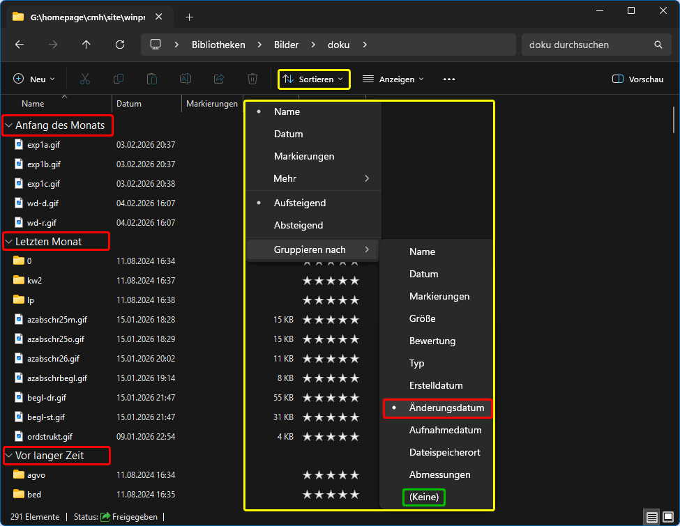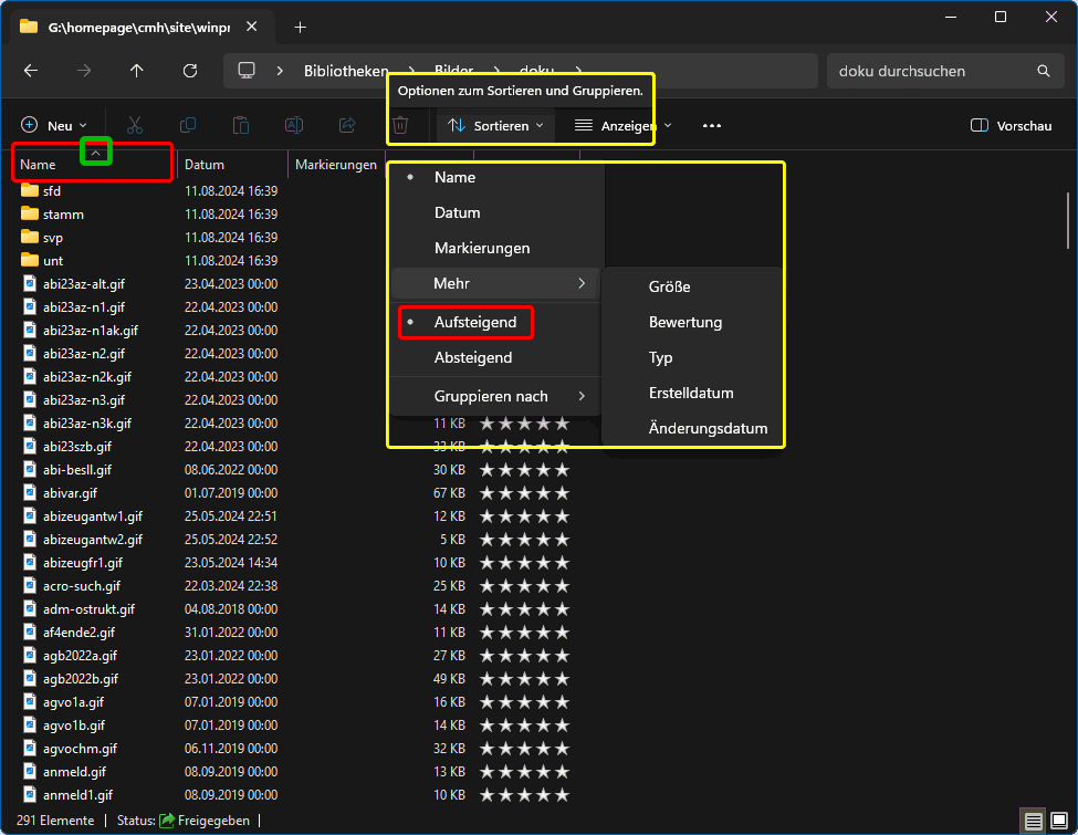 Über den Schalter Sortieren stellen Sie die Optionen zum Sortieren und Gruppieren ein (s.l.u.). Im Bsp. wird gerade nach Namen sortiert (gelb markiert) und das aufsteigend (rot markiert). Über Gruppieren kann u.a. eine "zweidimensionale" Sortierung eingestellt werden: im Bsp (s.r.o.) gruppiert nach Änderungsdatum (rot markiert) und in jeder Gruppe nach Namen. Wenn eine Gruppierung stört, kann sie abgestellt werden (grün).