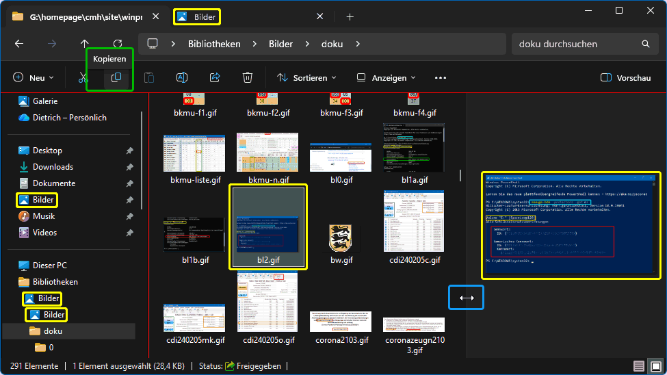 Die Statuszeile ist selbsterklärend bis auf die beiden Symbole • Ansichten/Bedienung/Tabs Im Navigationsbereich wird ein Speicherort ausgewählt, also ein realer Ordner oder ein Link auf einen realen Ordner (aber nie eine Datei). Im Inhaltsbereich wird dadurch dieser Ordner geöffnet dargestellt, also ggf. mit allen Dateien und Unterordnern der aktuellen Ebene. Im Bsp. (s.o.) ist gerade der Bilderordner doku ausgewählt; das Bild bl2.gif ist aktiviert und wird daher im Vorschaufenster angezeigt (gelb markiert). Die Grenze zwischen den beiden Fenstern kann verschoben werden (hellblau markiert).