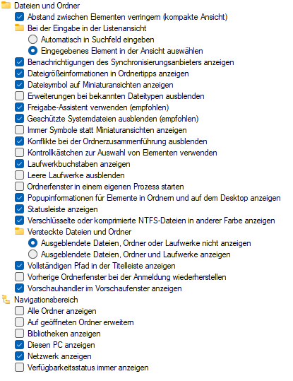 ☐ Bibliotheken anzeigen und ☐ Netzwerk anzeigen werden oft nicht benötigt. Im Gegensatz daz ist die Option ☐ Alle Ordner anzeigen für das eingangs gezeigte Chaos verantwortlich, sollte also inaktiviert bleiben.
