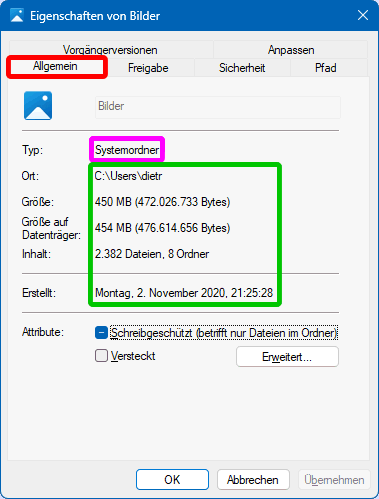 Im Bsp. wurde der Ordner Bilder untersucht, der in C:\Users\dietr liegt, wie der Karteikarte Allgemein zu entnehmen ist. Auf der Karteikarte Pfad ist genauer ablesbar: C:\Users\dietr\Pictures. Beides zeigt, dass im System mit englischen Begriffen gearbeitet wird und nur der Explorer (nicht aber andere Dienste) auf die jeweilige Landessprache übersetzt.