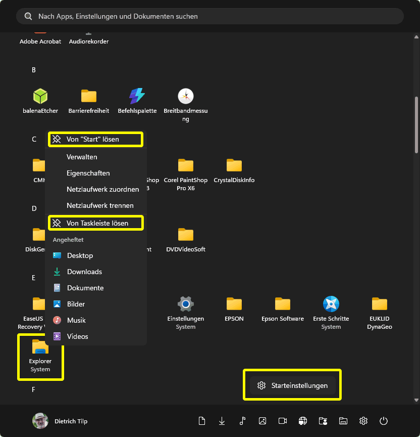 Aber natürlich kann der Explorer auch über die Taskleiste gestartet werden, wenn er dort abgelegt ist. In der Liste aller Apps oder über die Apptabelle kann der Explorer über sein Kontextmenü (Rechtsklick) an den Start und an die Taskleiste geheftet oder davon gelöst werden (s.r.). Und durch Rechtsklick in einen freien Bereich werden die Starteinstellungen (= Personalisierung > Start) aufgerufen (s.r.o.). Dort kann die Abteilung Andere > Ordner geöffnet werden, in der die Apps ausgewählt werden können, die unten neben dem Netzschaltersymbol eingeblendet werden sollen. ∘ 3. Desktopsymbole