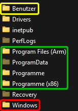 Die grün markierten Ordner sind die Standardinstallationsordner für Programme (und deren Daten), gegliedert nach 32-Bit-, 64-Bit- und ARM-Programmen.