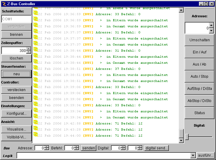 Im Controller-Fenster der Z-Bus-Homecontrol (s.r.) werden alle Bus-Ereignisse protokolliert und von dort aus wird die Z-Bus-Homecontrol konfiguriert und die Visualisierung aufgerufen, die der graphisch unterstützten Steuerung des Z-Bus dient.