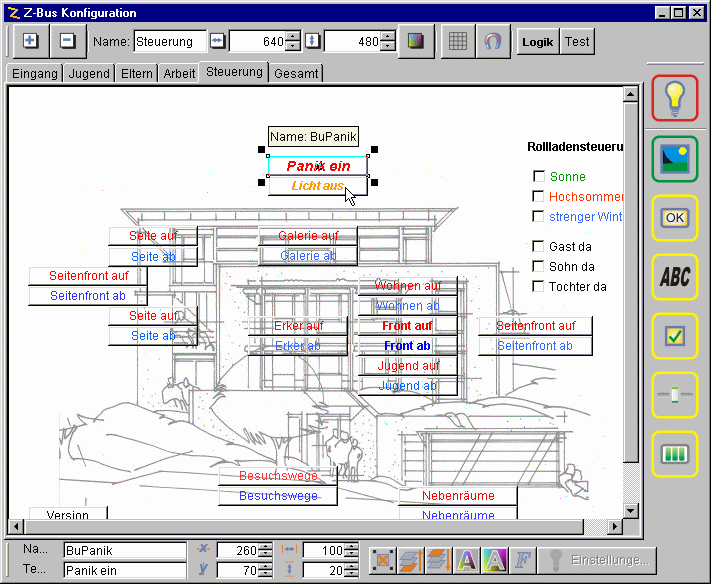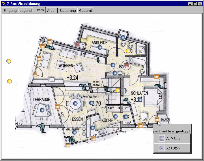 Nebenstehendes Bild zeigt in der Visualisierung den Grundriss des Wohnbereichs samt aller dort verbauten Z-Bus-Elemente. Unschwer ist zu erkennen, wo Rollläden montiert sind (die meisten gerade offen, aber einer geschlossen), wo Lampen montiert sind und welche davon eingeschaltet sind. Der Rollladen rechts unten in der Grafik ist durch Anklicken aktiviert, er kann jetzt mit der PC-Maus gesteuert werden. Auf einem (berührungsempfindlichen) Touch-Screen könnte die ganze Steuerung direkt mit der Fingerspitze erfolgen. Z-Bus-Konfiguration