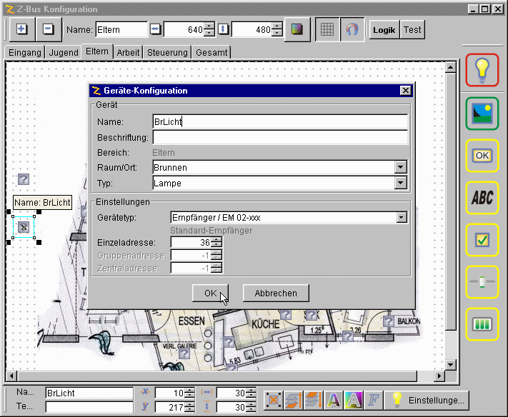 In nebenstehendem Bild sieht man, wie gerade das Brunnenlicht "visualisiert" wurde. D.h., das Symbol für das Brunnenlicht wurde definiert und anschließend im Grundriss platziert. Zur Definition wird durch Klick auf das Lampensymbol oben rechts die Geräte-Konfiguration gestartet. Dort wird (mindestens) Name, Gerätetyp und Einzeladresse angegeben. Nach Schließen des Geräte-Konfigurations-Fensters wird das Brunnenlicht-Symbol an die gewünschte Stelle verschoben. In gleicher Weise werden alle anderen vom PC aus zu steuernden Geräte definiert und platziert. Das Feld Beschriftung bleibt jedesmal leer, damit die Symbole im Plan schön klein bleiben können. Damit ist die gerätemäßige Konfiguration der PC-Steuerung abgeschlossen und der Z-Bus kann vom PC aus gesteuert werden. Bis hierher sind keine Programmierkenntnisse nötig. Möchte man jedoch die oben angesprochenen logischen Gruppenschaltungen und Zeitsteuerungen einsetzen, sind geringe Programmierkenntnisse hilfreich, da nun Java-Script zum Einsatz kommt. Der Lohn ist eine hundertprozentig auf die eigenen Bedürfnisse zugeschnittene Hausleitsteuerung. Reine Zeitsteuerungen finden keine Repräsentation in der Z-Bus-Visualisierung, werden also nur in der Logik-Steuerung (Java-Script) mittels Logik-Editor definiert. Schaltflächen (buttons, Knöpfe) und Wahlflächen (checkboxes, Anhak-Kästchen) müssen jedoch erst im Konfigurations-Fenster definiert werden und anschließend in der Logik-Steuerung verknüpft werden.