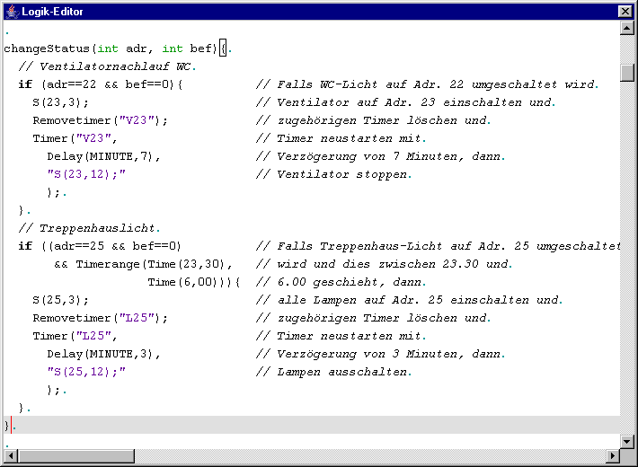 Der Z-Bus-Logik-Editor ist geschickt für kleinere Arbeiten während der Konfiguration, da er direkt aus dem Konfigurationsfenster herau gestartet werden kann. Für grundlegendere Programmierarbeiten sind aber Editoren wie Zu beachten ist die unterschiedliche Verwendung von runden und geschweiften Klammern ( ) { } . Die im obigen Beispiel dargestellte Methode (Funktion) changeStatus() wird vom Z-Bus-Server nach jeder erkannten Bus-Aktivität aufgerufen. Daher müssen alle Logikoperationen, die auf Bus-Aktivitäten reagieren sollen, innerhalb dieser Methode definiert sein. Im Beispiel sind das die Ventilatornachlauf-Steuerung und die Treppenhauslicht-Steuerung. Da nicht ausgeschlossen werden kann, das die entsprechenden Schalter erneut betätigt werden, bevor die Timer abgelaufen sind, müssen diese immer zunächst gelöscht werden, bevor sie (erneut) gestartet werden. Timer werden immer folgendermaßen programmiert: Timer("Name",Zeitvorgaben,"Aktion");, wobei "Name" irgend ein eindeutiger Name ist, "Aktion" irgend eine Aktivität (z.B. ein Bus-Befehl), die in Abhängigkeit vom Eintreffen/Ablauf der Zeitangaben ausgeführt wird. Name und Aktion müssen immer in Anführungszeichen angegeben sein.