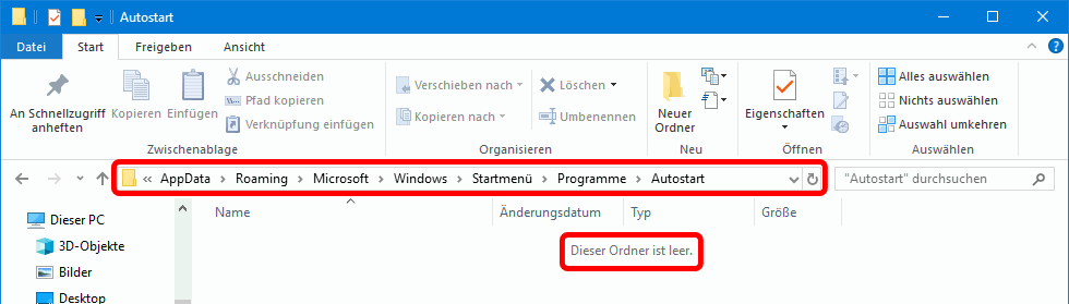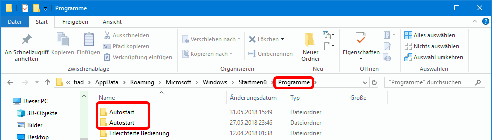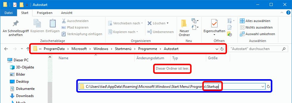 Öffnen: C:\Users\nnnn\AppData\Roaming\Microsoft\Windows\Start Menu\Programs\Startup Die beiden roten Ordner sind aber normalerweise versteckt und sind erst sichtbar, nachdem im Dateimanager > Ansicht > Optionen > Ansicht | versteckte Dateien und Ordner die Option Ausgeblendete Dateien, Ordner und Laufwerke anzeigen aktiviert ist. Schneller geht's im Dateimanager wieder mit dem Eintrag shell, diesmal shell:startup, bzw. shell:common startup.
