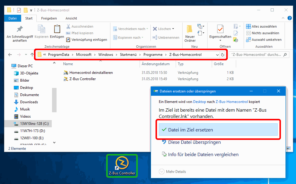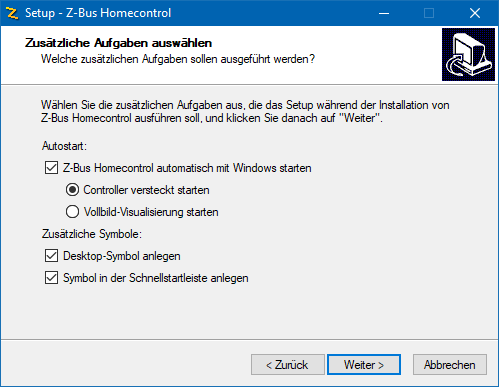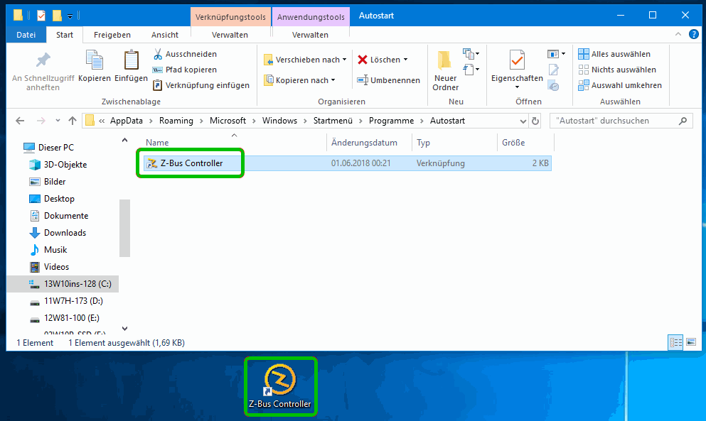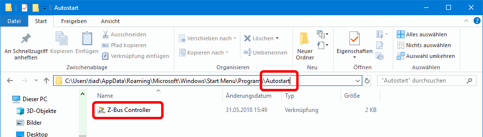 Damit ist Punkt 6 berichtigt. d) Berichtigung des Links im Autostart-OrdnerDa der Z-Bus-Controller non stop laufen sollte, sollte der Z-Bus-PC nie heruntergefahren werden, außer zu Wartungsarbeiten. Da ist es gute Praxis, die Z-Bus Homecontrol im Autostartordner zu verankern, damit sie beim Neustart auomatisch mit gestartet wird. Daher kann diese Autostartfunktionalität beim Installieren aktiviert werden (Punkt 6). Aber leider klappt das unter Windows 10 so nicht. Unter Windows 7 ist diese Autostartfunktionalität leicht nachrüstbar. Dort findet man über Start(menü) > alle Programme den Ordner Autostart. In dessen Kontextmenü (Rechtsklick auf den Ordner) sind die beiden Einträge Öffnern und Öffnen - alle Benutzer vorhanden. Dort hinein kann man den (berichtigten!) Start-Link der Z-Bus Homecontrol vom Desktop aus oder vom entsprechenden Startmenü-Ordner aus hineinkopieren. Das sind zwei unterschiedliche Ordner, wir empfehlen den zweiten.