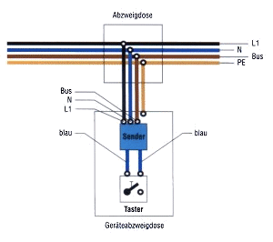 Um einen Sender/Empfänger in einer Unterputzdose/Verteilerdose einzubauen, sollten die drei Leiter L, N und Bus mindestens 10 cm (besser 15 cm) frei vom Dosenboden aus heraus kommen; die Enden werden dann um 11 mm abisoliert und