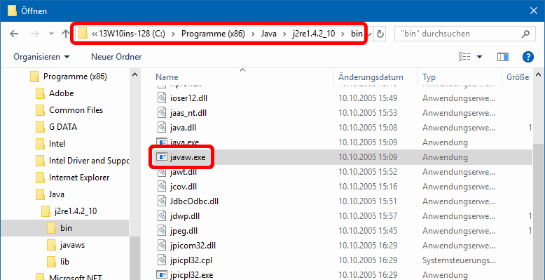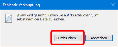 Beim Programmaufruf wurde offensichtlich die Java-Standardbibliothek javaw.exe nicht gefunden, weil sich die Aufrufverwaltung seit Windows XP geändert hat. Dadurch sind die Links in den zuvor aufgeführten Punkten 3 - 6 mit nun falschen Parametern ausgestattet und funktionieren daher nicht unter dem aktuellen Windows. Berichtigung der Linksa) Berichtigung des Links auf dem Desktop