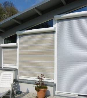 Daher war eine leistungsfähige Beschattungsanlage zu planen. Die Rollläden (teils bis zu 3 m hoch) sollten elektisch bedienbar sein und die Steuerung sollte unaufdringlich gestaltet werden (also keine "Schalterbatterien"). Ferner war eine Steuerungslogik wünschenswert mit Gruppenschaltung (z.B. "Süd-Seite: alle Rollläden runter/rauf") und Zeitsteuerung (z.B. "18:00 Uhr: alle Rollläden rauf" oder "von 21:00 bis 24:00 Gartenbeleuchtung an"). Dabei war für Urlaub usw. eine Anwesenheitssimulation geplant. Dabei stellten z.B. die drei nebenstehend gezeigten Fenster eine besondere Herausforderung dar, sollten sie doch gemeinsam, also mit einem Klick, in die Schattenstellung gefahren werden können (bei unterschiedlicher Rollladen-Laufzeit).