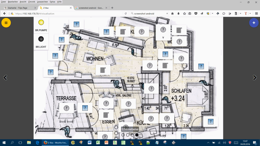 Auf einem Touch-Display müssen große Schaltflächen mit "griffigen" Schaltoptionen angeboten werden; aber dann passen zu wenige auf ein Smartphone-Display. Also müssen dort einzelne Räume aufrufbar sein. Auf einem PC-Monitor genügen filigrane Ausführungen, die mit der Maus angesteuert werden. Also kann dort ein ganzes Stockwerk oder sogar das ganze Haus dargestellt werden. Derzeit warten wir auf das geeignete "Responsive Webdesign" und vor allem auf die Integration der Logiksteuerung. ![]() 5. Anhang I: Technische Details