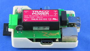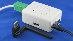 An der linken Schmalseite befindet sich oben der Stromnetzanschuss (incl. Bus-Anschluss); darunter ist die SD-Speicherkarte für Programm und Daten eingesteckt. Vorne befindet sich ein HDMI-Bildschirmanschluss. An der rechten Schmalseite ist der LAN-Anschluss für das heimische Netzwerk angeordnet, dahinter befinden sich zwei USB-2.0-Anschlüsse z.B. für Tastatur und Maus oder einen WLAN-USB-Adapter. Für den Betrieb genügt es, das Interface ans Stromnetz und den Z-Bus, sowie ans Heimnetz anzuschließen (s.o.m.). Der im Bild beigelegte WLAN-Adapter soll nur an später möglichen Wireless-Betrieb erinnern. Die erste Inbetriebnahme gelingt einfacher mit LAN-Anschluss (und mit einem über den HDMI-Anschluss verbundenen Bildschirm).